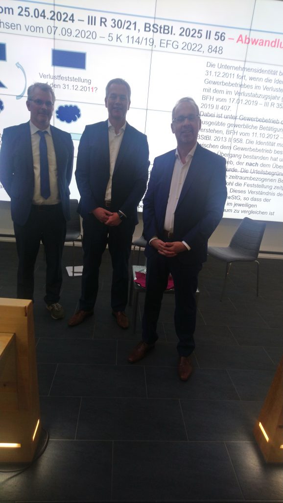 Am 30. Juni 2025 diskutierten RiBFH Dr. Christian Graw, RD Thomas Schöneborn, LL.M. , Finanzamt für Groß- und Konzerbetriebsprüfung Aachen und Stefan Liedtke, LL.M., Rechtsanwalt / Steuerberater / Fachanwalt für Steuerrecht im lichtdurchflutetem Auditorium zusammen mit Teilenehmenden aus den Steuerabteilungen der Unternehmen, aus der Beraterschaft und aus den kommunalen Steuerverwaltungen über die praktischen Auswirkungen neuerer Entscheidungen des Bundesfinanzhofes sowie über die Einordnung der Entscheidungen durch die Finanzverwaltung. Sie Veranstaltung fand in diesem Jahr wieder in Präsenz und als Webinar statt.
